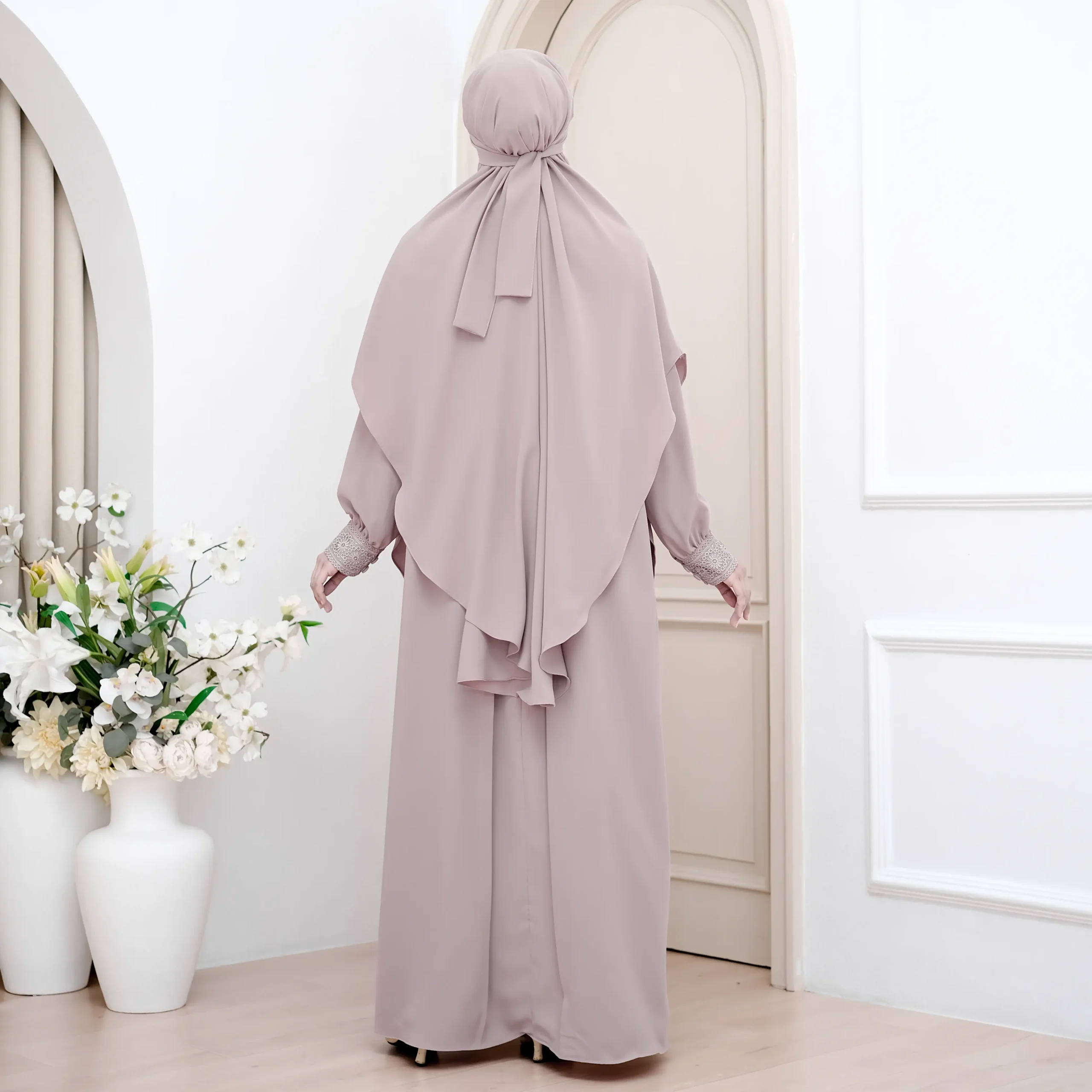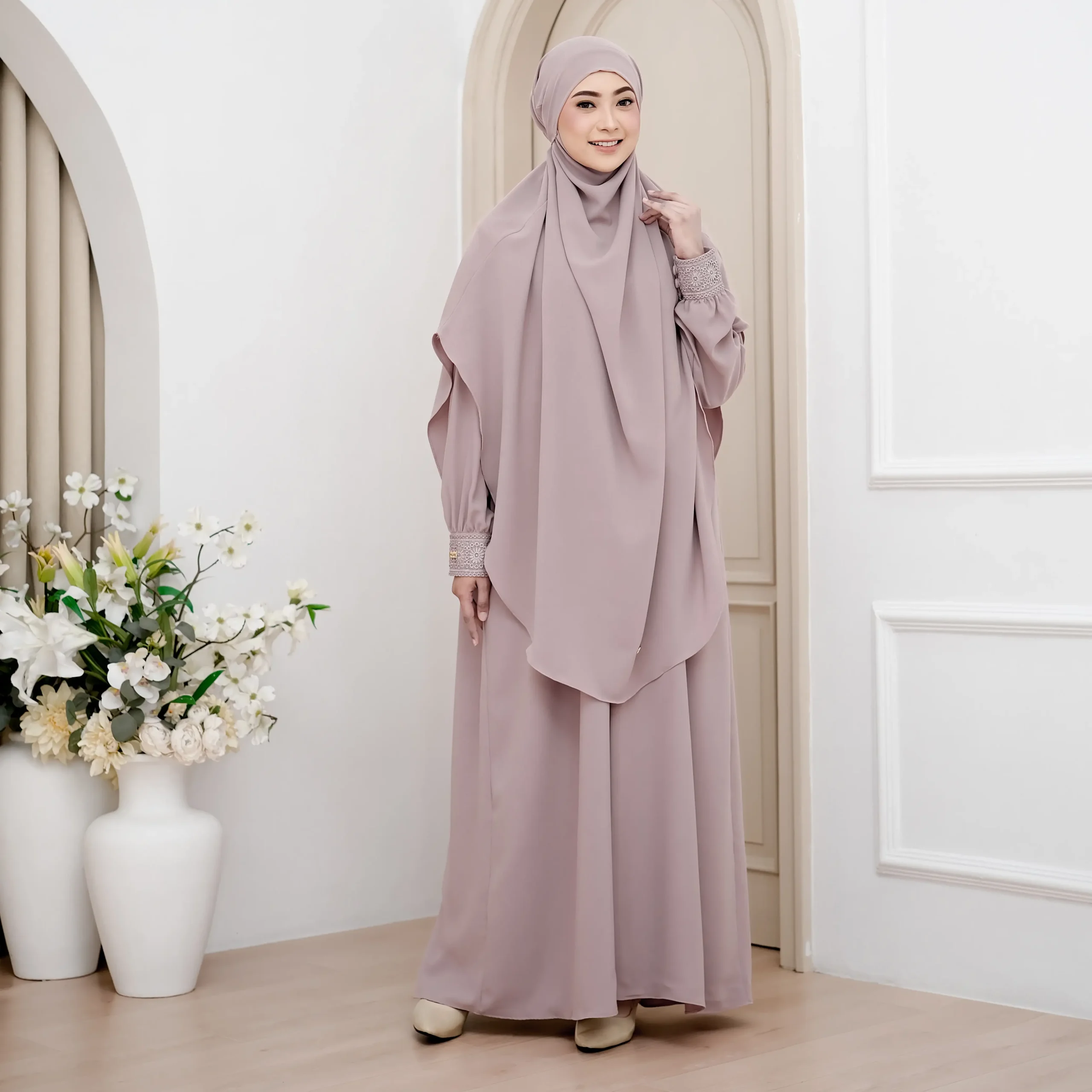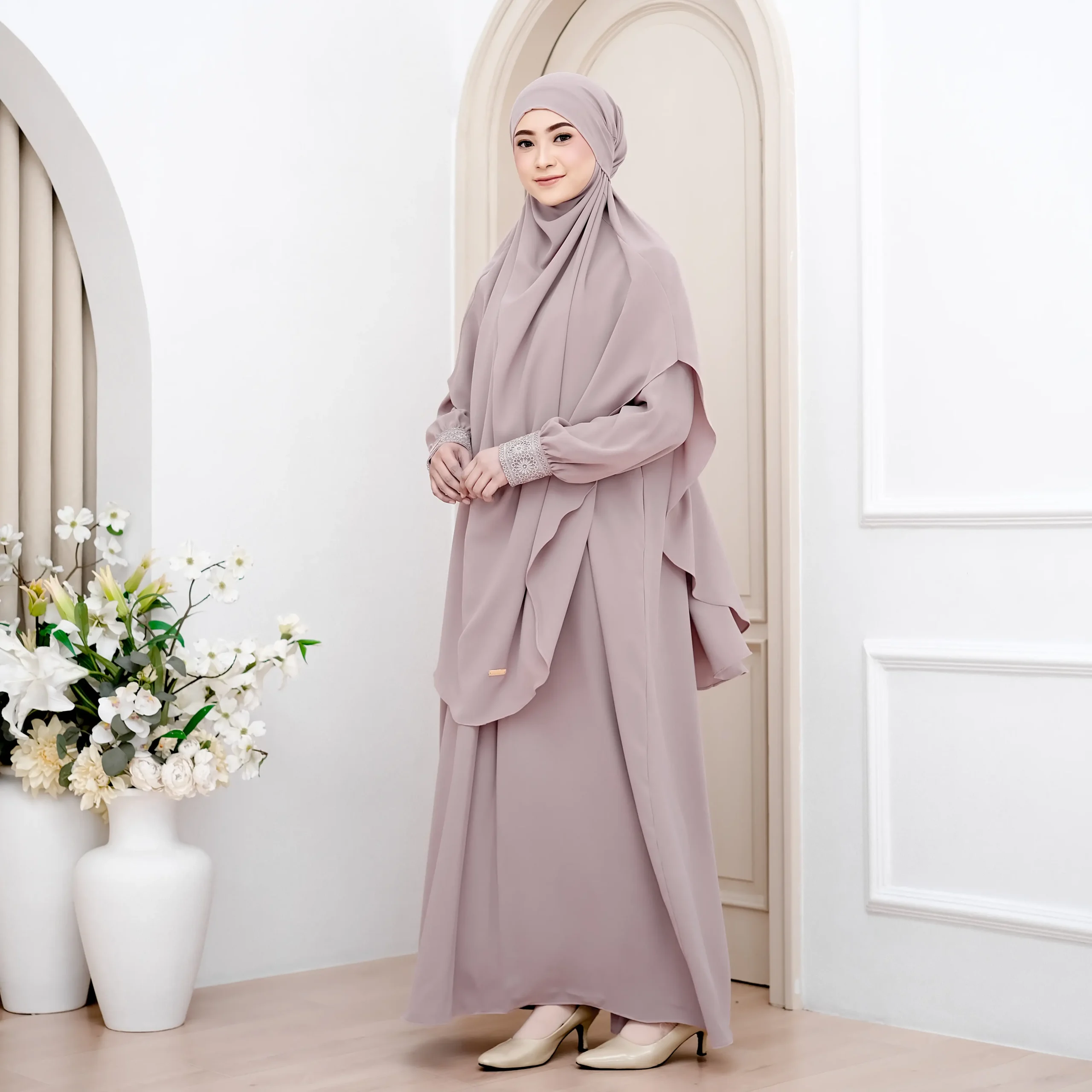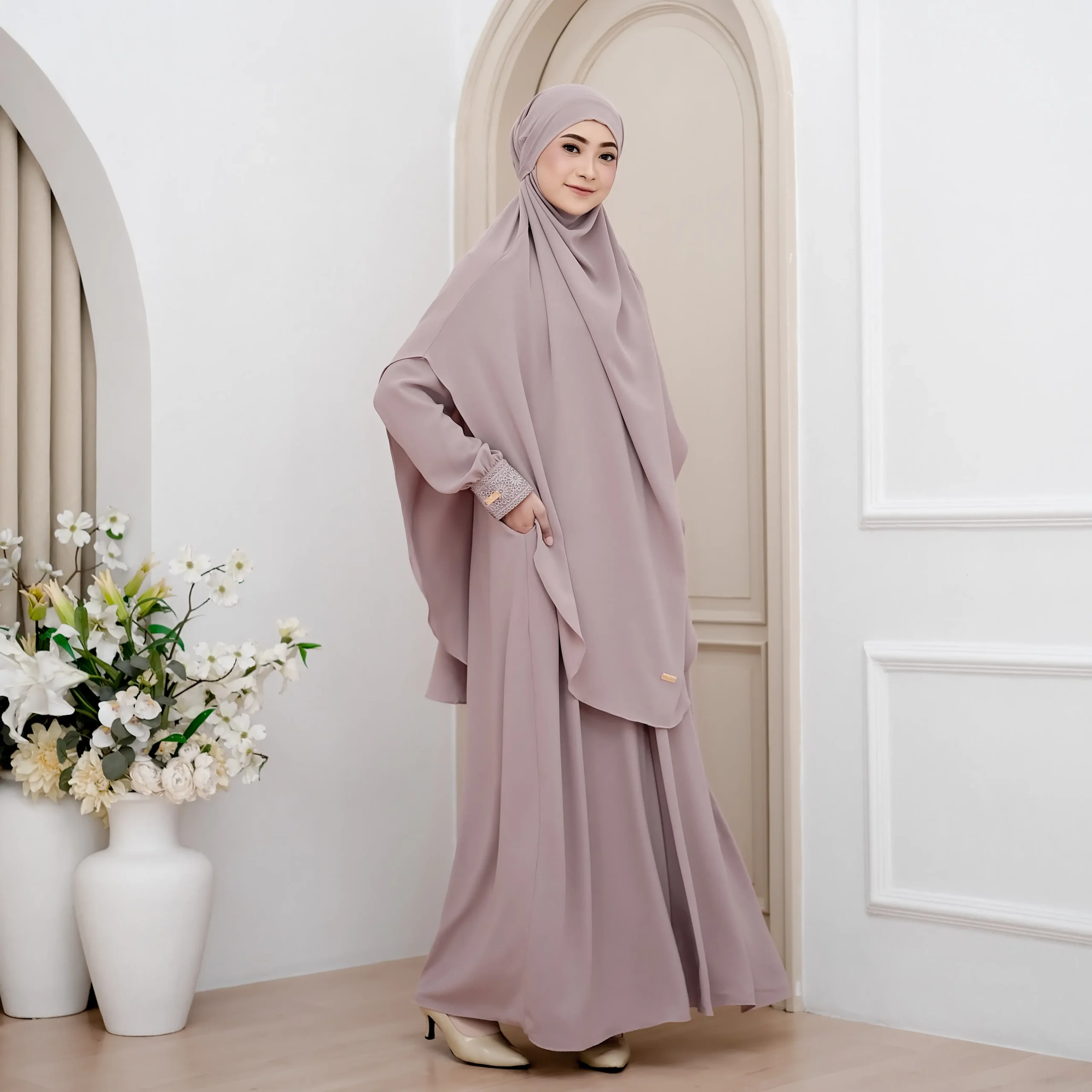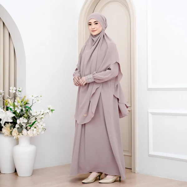 Menggunakan material exclusive premium fabric Anti UV , material ini membantu melindungi kulit dari paparan sinar matahari, menjaga rasa sejuk, serta memberikan kenyamanan optimal untuk aktivitas luar ruang, perjalanan safar, hingga ibadah umrah dan haji. Teksturnya ringan, breathable, dan flowy dengan sentuhan cotton feel yang halus, tidak mudah kusut, serta jatuh lembut mengikuti setiap langkah.