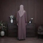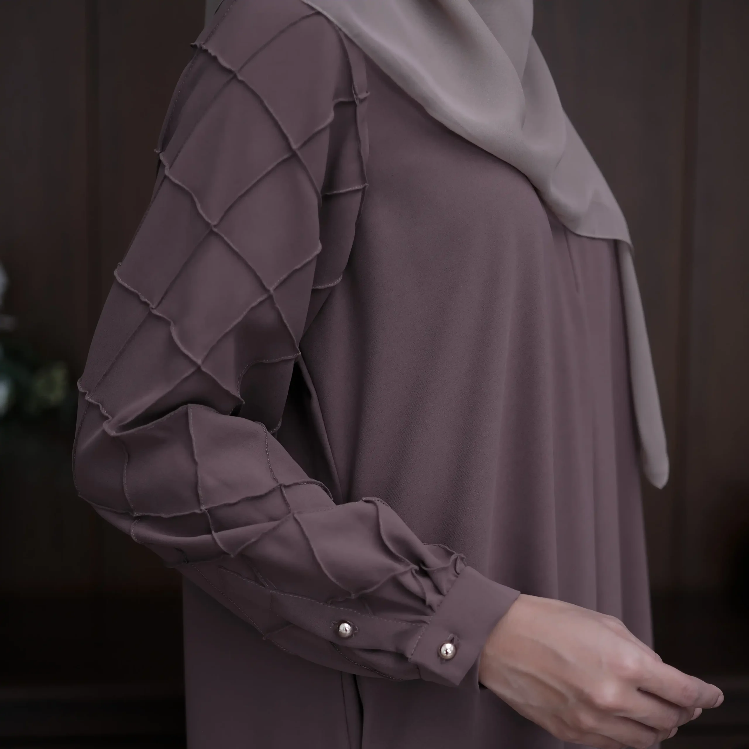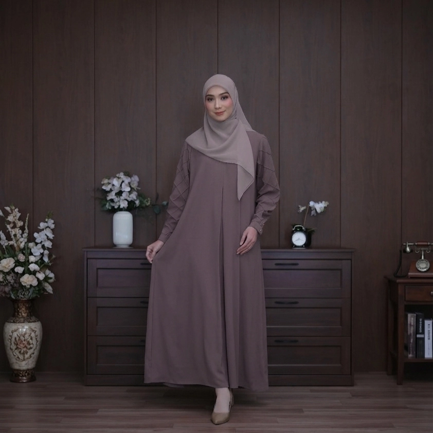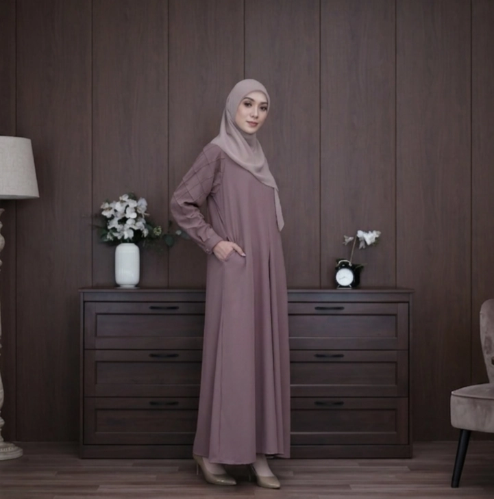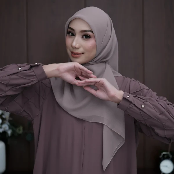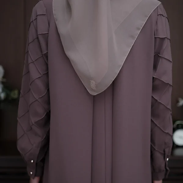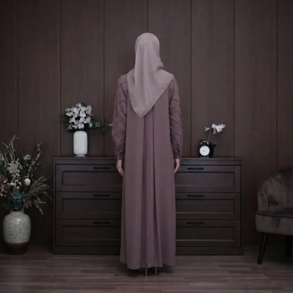 Keunggulan utamanya terletak pada statement sleeve detail Opnaisel diolah secara intentional sebagai elemen desain, bukan sekadar konstruksi. Jahitan ini menghadirkan aksen garis yang tegas namun refined, sekaligus memberikan tekstur modern yang memperkuat karakter abaya secara keseluruhan.