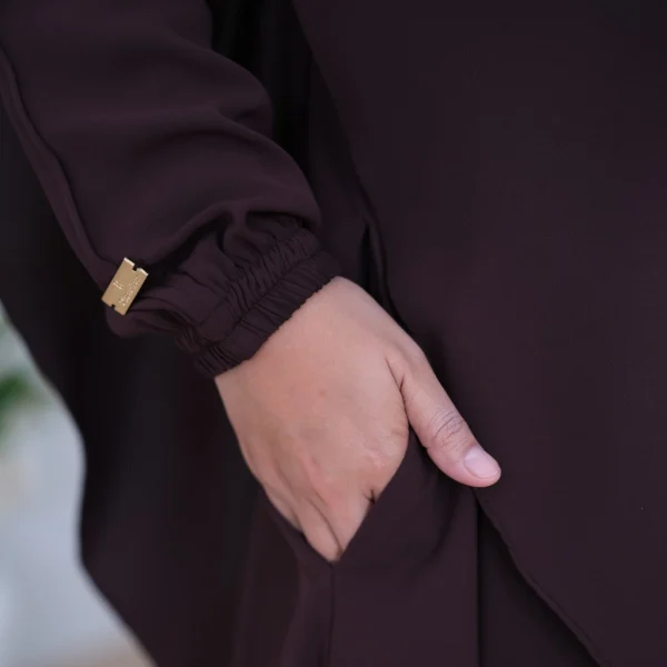 Pada bagian depan, terdapat bukaan hidden button agar tetap menjaga estetika yang rapi, nursing/busui friendly. Sementara detail lengan berkerut wudhu friendly menambah kenyamanan dan fungsionalitas tanpa menghilangkan kesan refined. Saku hidup di sisi kanan hadir sebagai solusi praktis untuk menyimpan barang kecil